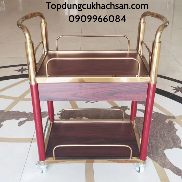 - Có 2 tầng đặt rượu, trà. Mỗi tầng đều thiết kế lan can bao quanh bằng inox vàng giúp các chai rượu, đồ vật đựng trên xe không bị rơi, đổ vỡ.